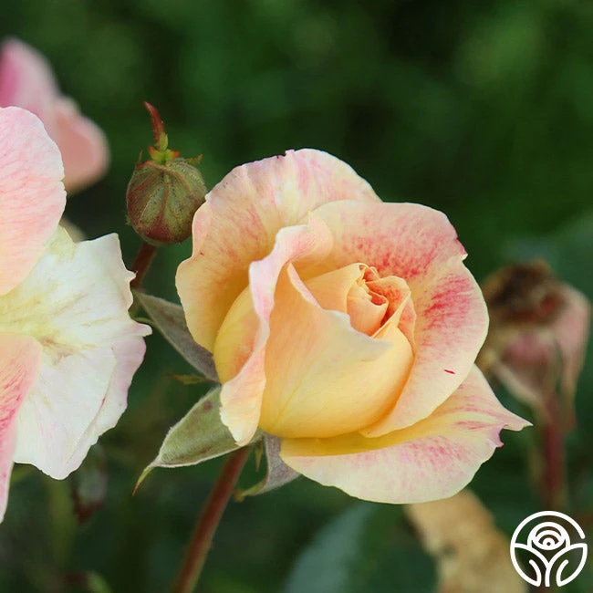 From England comes this showy, repeat blooming, hand-painted rose. Champagne Cocktail is well formed with 3 ½” blooms of soft yellow that are splashed and flecked cherry-red. Choose this rose for its wonderful fragrance and strong disease resistance.
