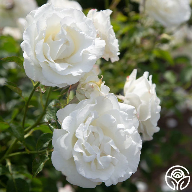 This classic, exhibition-style, pure white, continually blooming Hybrid Tea rose has earned many awards and is known for being one of the best white roses for the garden. Crystalline’s very large, 5.5” blooms emit a spicy and sweet fragrance from her beautiful clusters. Expect her to bloom in flushes throughout the season, performing best in zones 6-10. Watch out for her thorny stems!