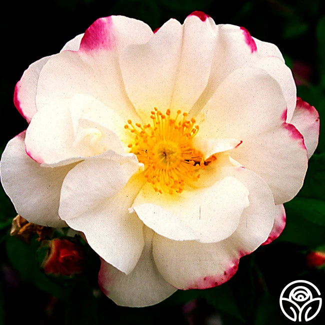 Hebe’s Lip is a delicate white to nearly white blend Damask with cherry-red edges and pink undertones – truly a delight for the eyes! She has a strong fragrance that gently wafts from her semi-double cluster blooms. While she is a once-bloomer, she creates a massive display in the garden. She has dark green foliage and can be quite thorny, but her fragrance makes up for it! Expect weeks’ worth of a stunning display of flowers.