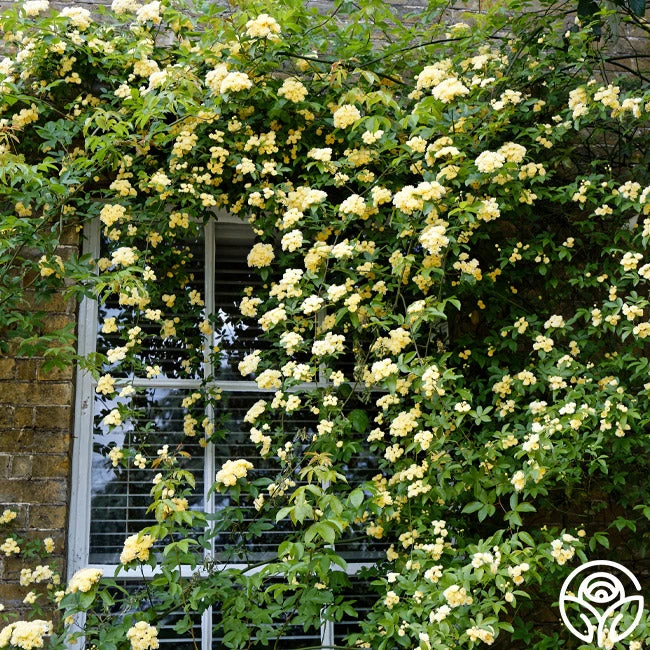 Lady Banks is the grandest of all Climbing Roses with the potential to grow up to 20′ tall! She can be trained to climb just about anything and does so with a grand display of flowers if you give her good soil drainage and sturdy support. Lady Banks is a rambling and nearly thornless rose that produces hundreds of miniature, yellow blooms and is a recipient of the Award of Garden Merit from the Royal Horticultural Society. Give her plenty of space and watch this drought-resistant Climber take off! Enjoy her all the way up to zone 9.