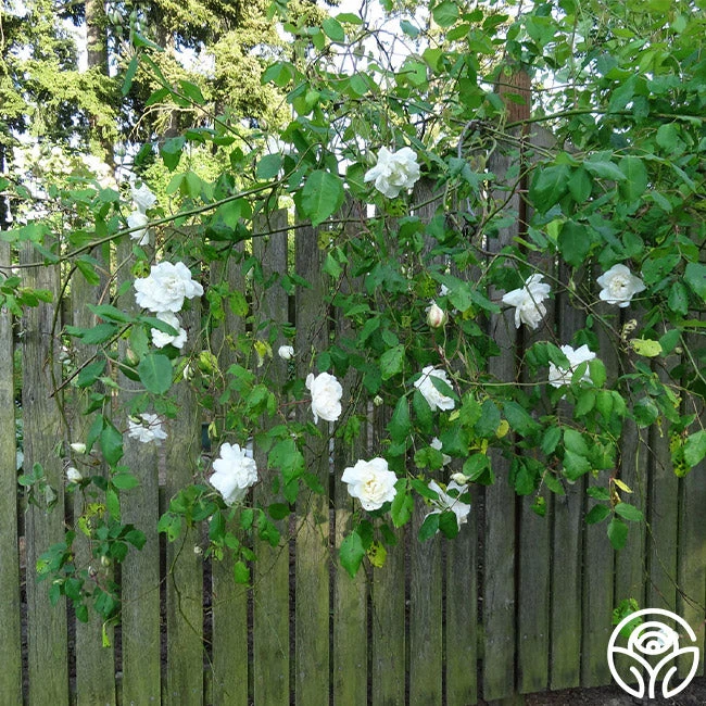 We are intoxicated by the fruity scent of Mme Alfred Carriére, one of the most fragrant of all roses. She produces clusters of large, globular, cupped, 3 ½” flowers with 40+ petals of soft pearl-pink, aging to cream. Mme Alfred Carriére is one of the hardiest Noisettes and can handle drought, a variety of soil types, and even shade. She is a vigorous plant with attractive foliage and minimal thorns, but she doesn’t like her leaves to stay wet so be sure to water at the base! This repeat blooming Climber will joyfully cover a fence, obelisk, or garden wall in no time.