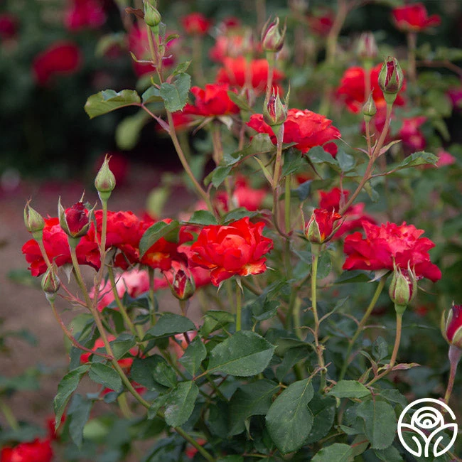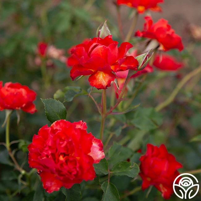 Sunrise at Heirloom is just as her name sounds, only without the many hot air balloons that dot the sky over our nursery in the mornings. She is a bright, fiery orange with ruffled 3″ blooms that profusely bloom. While she lacks a strong fragrance, this continually blooming bushy Shrub has very shiny green leaves to offset her flaming colors.