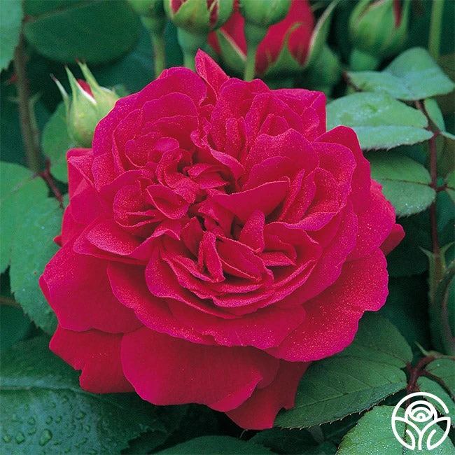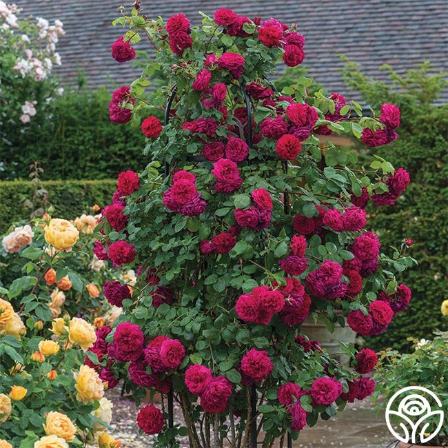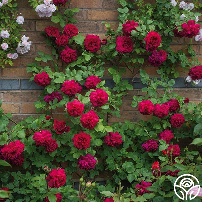 Named for the Thomas Hardy novel, Tess of the d’Urbervilles features large, fragrant, 4″ flowers with 70+ petals in a bright crimson color. Her blooms have a nice, deeply curved shape in the early stages, and then her petals turn back to a less formal flower. Tess’ blooms are hefty and usually bend over, giving an elegant, cascading effect to the bush. Her growth is robust and spreads against large, dark green foliage. We love Tess’ old rose and fruity-myrrh fragrance and that she is a generous, repeat bloomer. She can handle partial shade or pots and makes an excellent Climber.