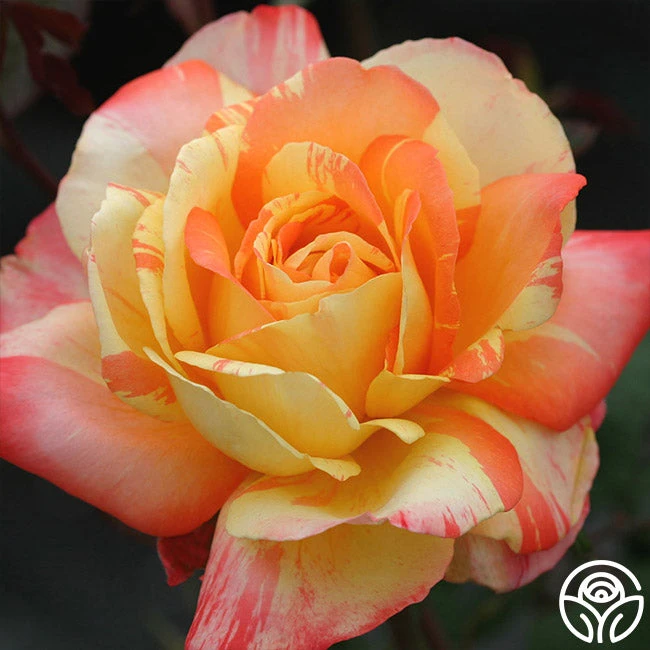 The unique flowers of soft gold with dramatic orange stripes makes Tropical Sunset a focal point of the garden. With petals that soften in color as she ages, Tropical Sunset features 4.5” blooms on tall, strong canes with deep, leathery foliage. We love that her moderate fruity spice fragrance reminds us of tropical drinks on vacation! Enjoy this “tropical sunset” in your own backyard every night.