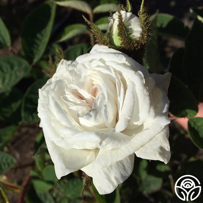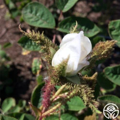 Introduced in 1807, White Moss creates a spectacular singular profusion of medium to large, pure white, double blooms of 17-25 petals with mossed buds. Her dark green foliage contrasts the pure white blooms beautifully. As with many old roses, she is full of thorns and prickles.